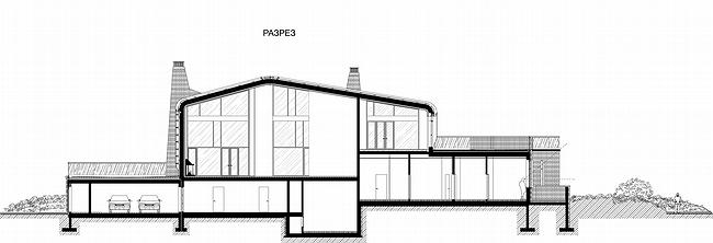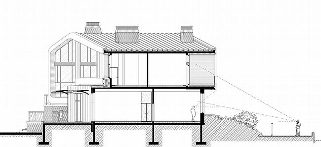 Два верхних уровня в каждом доме объединены в самостоятельный объем, отделка которого должна отличаться и материалом, и цветом. Внешняя поверхность двускатной крыши-стены отделана медью. Дополняет эту своеобразную интерпретацию традиций массивная каменная каминная труба, пристроенная к наружной стене.