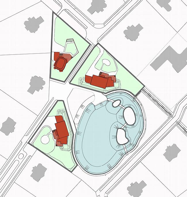 Все три участка имеют планы сложного абриса, приближенного к треугольнику. Два из них почти симметричны и находятся на самом берегу пруда, тогда как третий оказался в некотором отдалении. Хотя дальний от пруда дом и не находится ровно по центру между двумя другими, авторы проекта предпочли разыграть карту симметричности, благо можно найти ракурс, с которого третья постройка встанет именно посредине. Исходя из этого, прибрежные дома сделали зеркально-симметричными и горизонтальными, вытянутыми вдоль берега, тогда как дальнее здание более высокое и собранное, с жестким вертикальным зонированием. Со стороны пруда ансамбль напоминает о египетских мотивах – покатые зеленые крыши ассоциируются со скарабеями, каждый из которых взобрался на свой холмик, дабы фланкировать третий дом для зрителя, находящегося возле пруда, и пруд – для жильцов постройки. В других ракурсах больше похоже на то, что один дом заглядывает через плечо другого, стремясь взглянуть на воду. Кстати, последний этаж действительно задуман наподобие смотровой площадки с полностью остекленным павильоном зимнего сада и солярием.