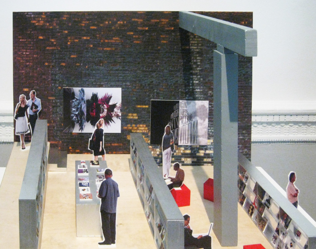 Двухэтажное здание дополнят мезонином, где расположатся конференц-зал, объединяющий функции лектория и кинозала, детская комната и медиатека. Над сценой в конференц-зале в качестве декорации будет расположено внушительных размеров окно с видом на фойе, которое на время кинопоказов будут закрывать подвесным черным экраном. Продумано все до мельчайших подробностей: прозрачный пол в детской комнате позволит родителям наблюдать за ними, сидя в кафе на первом этаже. Мебель кафе будет выдержана в советском стиле, для примера Колхас продемонстрировал изображение стула, спроектированного Иваном Леонидовым.