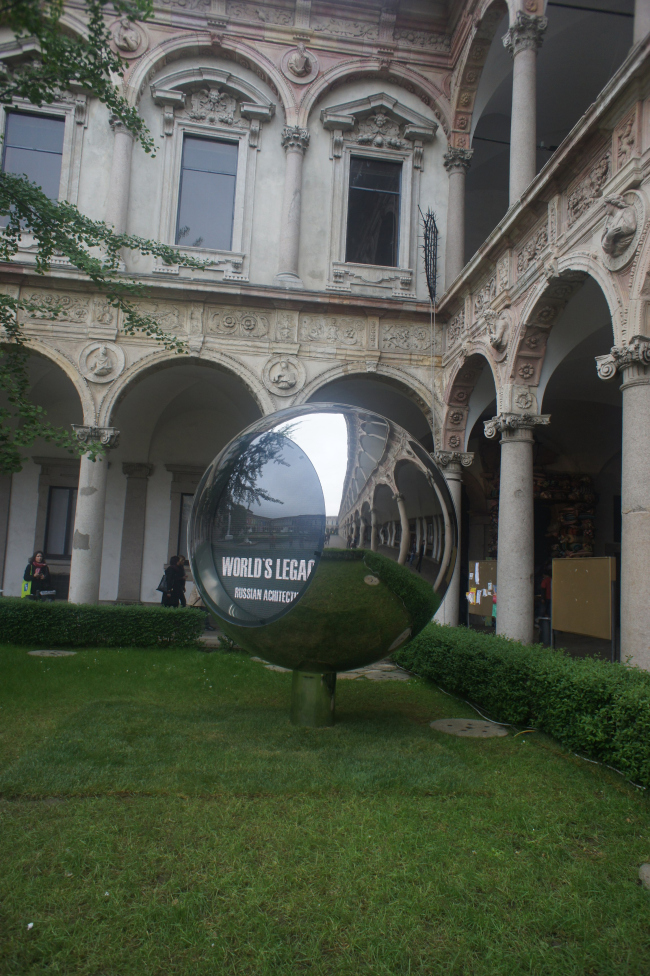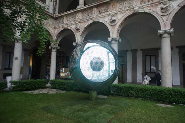Арт-объект бюро SPEECH Чобан&Кузнецов расположен в главном дворе, в правом от входа углу. Угловое местоположение, между затемненной галереи и ярко освещенной лужайкой, выгодно подчеркивает совершенство формы объекта – шара с зеркальной поверхностью, в которой эффектно отражается двухъярусная колоннада здания, голубой небо, трава и проходящие мимо люди.
