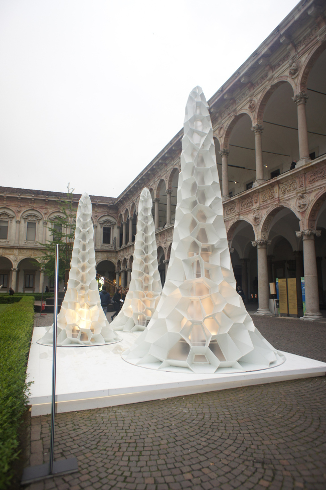 Чуть левее от входа китайский архитектор Цанг Ке (Zhang Ke) «вырастил» три разновеликих белоснежных сталагмита. Его инсталляция носит название Village Mountains. Жители горных деревушек Китая постепенно переселяются в города, но желание жить в горах в своем доме остается неизменным – чтобы удовлетворить это стремление архитектор предлагает создать горы в городе, предоставив каждой семье отдельную, напоминающую соты ячейку, в которой они могли бы создать свой дом. Таким образом он планирует достичь гармонии между традицией и современным городским образом жизни.