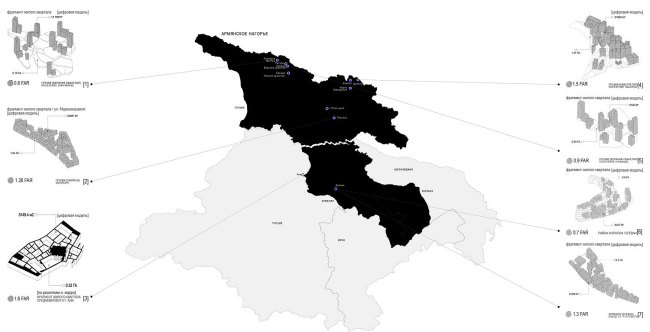 Р.А. Я остановился на ключевых цивилизационных моделях, принятых в современной социологии, выделив доиндустриальный, индустриальный и постиндустриальный периоды. В качестве территориальной привязки выбрано Армянское нагорье – 7 жилых образований. В данном случае территориальная привязка довольно условна, поскольку пустота обладает большей географической гибкостью, чем материя, и не может быть привязана к конкретному региону. При этом изменение пространственных характеристик рассматривалось с учетом общемировых политических, экономических и технологических реформаций, системы ценностей и принципов формирования характерных для того или иного периода. В результате ретроспективного анализа был составлен временной инфографик, иллюстрирующий «мутацию» пространственных характеристик жилой среды в процессе смены основных исторических эпох (). Так, квартал VII-VI тысячелетия до н.э. был довольно компактным (0.17 га) и имел нерегулярную структуру. Античный период рассмотрен в контексте перехода от естественного принципа формирования жилых образований, свойственного архаичным поселениям, к принципу предварительного планирования. Данный принцип основан на регулярной планировке, интегрированной в естественный рельеф местности. Как следствие – геометрически правильная форма квартала и его увеличение до 0.93 га.