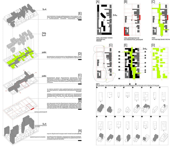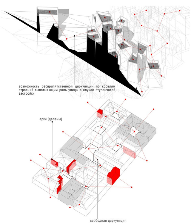 Р.А. Думаю, в них есть скрытый потенциал, который, по моему субъективному мнению, недостаточно изучен и неправильно интерпретирован. Опираясь на традиционные ценности, я разработал , которые вполне применимы в современном городе и объективно способны повысить качество жилой среды. Квартал сегодня строится преимущественно по периметру, внутри него остается огромная и никому конкретно не принадлежащая дворовая территория. Такое построение обедняет визуальные сценарии, сводит на нет идентичность места, увеличивает дистанции перемещения. Разработанный мной принцип полицентричности позволяет отойти от общего двора и приблизиться к средневековой планировочной структуре с множеством уютных микродвориков. При этом плотность застройки сохраняется, а этажность снижается до сомасштабной человеку. Таким образом, принцип предлагает альтернативу устоявшейся моноцентричной структуре жилой застройки в виде взаимосвязанных жилых пространств разного размера и конфигурации в пределах того же участка.