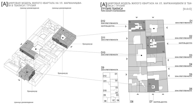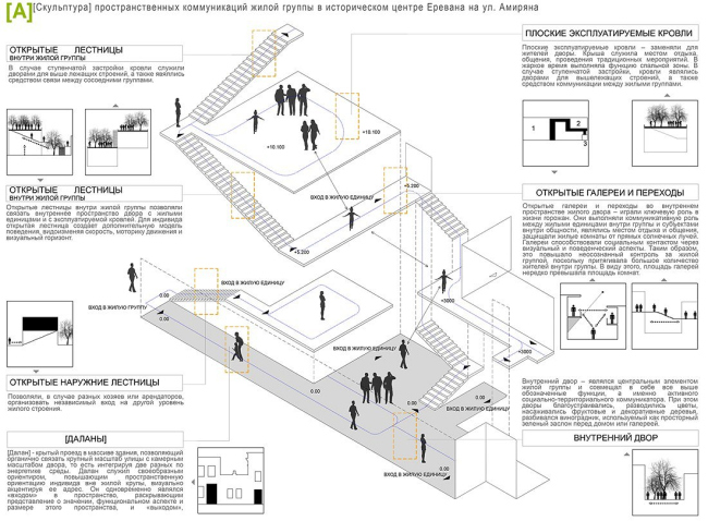 Следующий принцип – регламентация зон ответственности. В качестве примера я рассмотрел квартал XIX в. в центре Еревана по улице Таманяна. Этот район имел свою уникальную городскую среду, где у каждого домовладения была своя зона ответственности. В советское время центральные кварталы претерпели серьезные изменения, обросли новыми, чужеродными объектами.