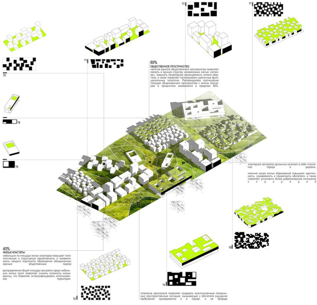 Согласно с принципом архипелагов высокоплотная многоэтажная застройка перераспределяется, органично сочетая в себе типологии города и деревни. Другими словами, в одном жилом кластере одновременно присутствуют и городское образование, и парковое, и загородное.