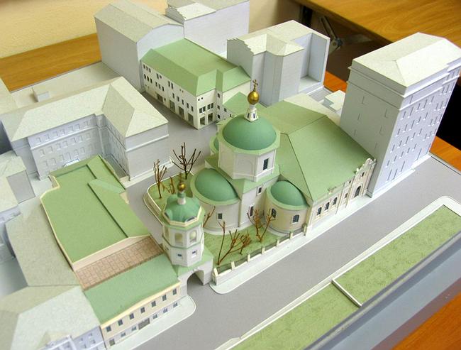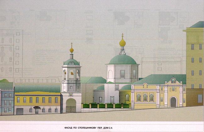 Архитектор Павел Андреев представил проект восстановления колокольни церкви Космы и Дамиана в Шубине. Она расположена недалеко от памятника Юрию Долгорукому на Тверской, в самом начале Столешникова переулка. До 1930-х гг. западнее храма, по красной линии переулка, стояла колокольня, сначала ампирная, потом, после переделки на средства «почетных граждан» А.В. и И.В. Борисовских в середине XIX века, псевдорусская. В 1930-е гг. колокольню сломали и рядом построили большой «сталинский» дом; в подвалах которого, кстати, недавно обнаружились остатки сводов жилых палат XVII века, целого комплекса, который так и не удалось серьезно исследовать из-за строительной спешки. Проект Павла Андреева, правда, не имеет никакого отношения ни к этой истории, ни к этой части застройки. Он предполагает строительство новой храмовой колокольни с противоположной стороны от ее исторического места, к востоку от церкви – потому что если попытаться поставить ее на прежнем месте, колокольня загородит окна жителям сталинского дома, и кроме всего прочего, добавим от себя, в перспективе со стороны Тверской будет совершенно не видна. Итак, при церкви Космы и Дамиана предполагается построить колокольню и два административных здания, одно по красной линии, второе – в глубине двора. Колокольня, оказавшись на новом месте, не воспроизводит ни одну из бывших здесь ранее, она достаточно точно стилизована под начало XVIII века – время, которому принадлежит большая часть архитектурных форм существующего храма. Добавленный по линии улицы домик, напротив, будет ампирным, желтым и с рустованным нижним этажом. Аккуратная стилизация была в целом одобрена экспертами.