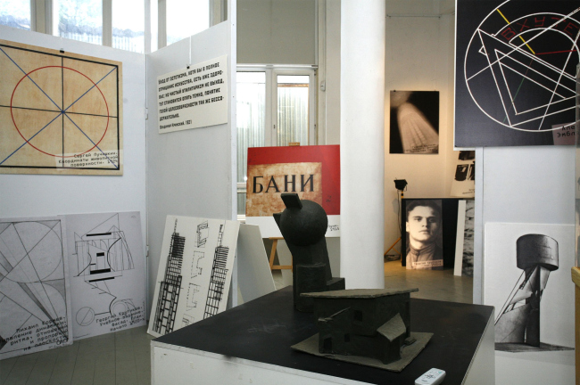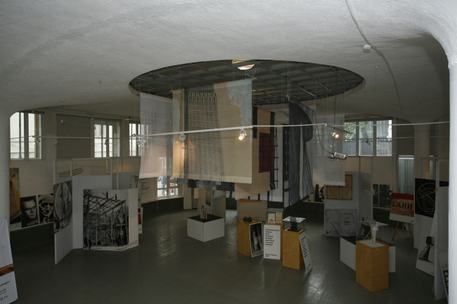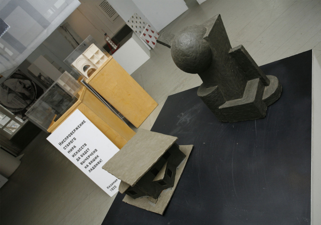 Пространство экспозиции трактовано как модель мастерской-студии, где, в постоянном споре между различными направлениями рождается явление русского художественного авангарда. Предметная среда взаимодействует с архитектурно-историческим контекстом интерьера, в котором в начале прошлого века находились мастерские ВХУТЕМАС-ВХУТЭИН. На планшетах, расставленных и развешанных в кажущемся беспорядке («модель идеальной среды, среды граничной между организованностью и свободой, среды в которой можно жить, среды мастерской» – А. Ермолаев), – представлены работы мэтров русского авангарда – Казимира Малевича, Владимира Татлина, Ивана Пуни, Константина Мельникова, Любови Поповой и других. Методические разработки и учебные работы на выявление масс, цвета, пространства и конструкции, созданные в мастерских Николая Ладовского, Владимира Кринского, Густава Клуциса, Александра Родченко. Проектная графика – проекты и макеты городов будущего, кузнец, элеваторов, водонапорных башен, интерьеров рабочих клубов, эскизы мебели. Галерея фотопортретов героев книг Хан-Магомедова «охватывает» концентрически закрученную композицию выставки, голоса героев его книг «звучат» в программных высказываниях, напечатанных на белых планшетах.