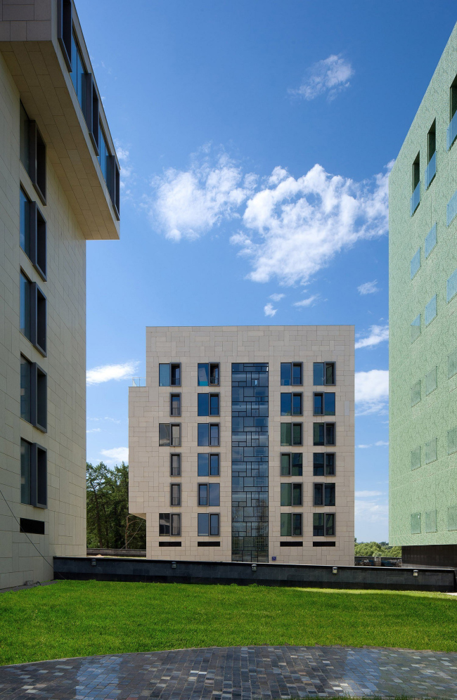 Вообще нельзя не отметить, что подобная лаконичность и нарочитая «неагрессивность» фасадных решений стали отличительной чертой данного проекта. Только «Кубусы» – дома немецкого бюро AssmannSolomon, – изначально самые крупные из всех, получили объемно разработанные фасады с заметными выносами, к чему остальные авторы отнеслись с подчеркнутым уважением, сделав все для того, чтобы в рамках довольно плотной застройки жилого комплекса объемы не «толкались локтями».