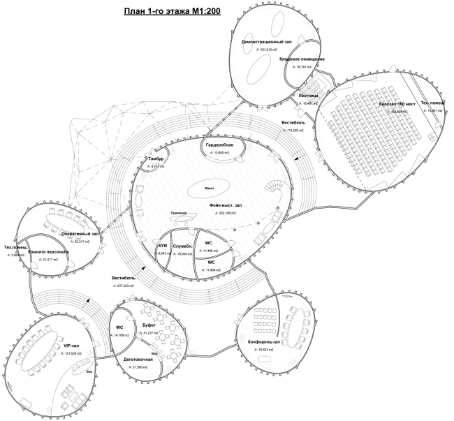 Впрочем, несмотря на проведенные параллели, архитекторы не пошли по пути заимствования архитектурных форм конструктивизма. Ключевую роль в формообразовании сыграл сам остров – уникальное место, где люди с доисторических времен жили в гармонии с природой. Поскольку проект был конкурсным, «Группа АБВ» с самого начала решила разработать два максимально различных варианта. В основу одного из них, того, что в результате и был выбран заказчиком, легла характерная для Сахалина форма рельефа – невысокие горные хребты, нагромождение скал, срезы слоистых, покрытых эрозией почв. По словам самих авторов, общая схема плана напоминает ящерицу, которая выползла на холм и пригрелась на солнцепеке. Большое внимание в проекте уделено и климатическим особенностям – на Сахалине довольно жаркое и долгое лето и очень холодная снежная зима, – а также вопросам сейсмической безопасности будущего комплекса. Именно последнее обстоятельство во многом продиктовало композиционное решение центра: здание спроектировано двухэтажным и имеет трехчастную структуру. Кинозал, лекторий, выставочный зал, конференц-холлы, компьютерный класс и специальное помещение, которое в случае землетрясения может служить убежищем и центром управления, свободно занимают ячейки нерегулярно прорисованного плана.