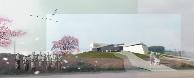 Главный объем расположен на вершине холма и имеет плоскую эксплуатируемую кровлю, решенную как вместительная смотровая площадка, с которой открывается великолепный вид на океан. На нее ведет отдельная наружная лестница, с высоты птичьего полета отчетливо напоминающая лапу ящерицы. Остальные части остроугольного объема накрыты скатными кровлями и спускаются по склону холма, делая здание похожим на горную гряду. Это ощущение усиливается благодаря ленточным окнам, которые под разными углами членят бетонную поверхность стены, а полностью слиться с ландшафтом объему не дают фасады, отделанные ярким узором, отсылающим к национальному костюму айнов – народности, некогда жившей в этой части Сахалина. Интересно, что часть орнамента планируется сделать объемным, а часть наложить на стекло, что создаст красивую игру теней в интерьере.
