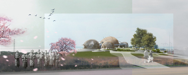 И если в этом проектном предложении архитекторы создали единую структуру, то в другом варианте концепции каждая функциональная зона вынесена в собственный объем, а они в свою очередь объединены стеклянным пространством холла. В этом случае авторы также искали вдохновение в окружающей природе, но уже не на суше, а в океане. Комплекс, собранный из разрозненных объемов, напоминает острова, разбросанные по бескрайним водным просторам, или покатые камни гальки, которых очень много на здешнем побережье. Между собой корпуса, как уже говорилось, соединены прозрачной структурой: стеклянную структуру куполов несут на себе деревянные ребра экзоскелета каждого из объемов, которые подвижно закреплены на основании и за счет этого делают всю конструкцию сейсмоустойчивой. Кроме того, ламели, закрепленные между ребрами, задуманы как поворотные, с их помощью можно регулировать количество солнечных лучей, которые попадают в здание, тем самым существенно экономя расходы на кондиционирование комплекса.