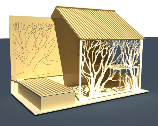 Не менее чистое и лаконичное решение предложили Сергей Гикало и Александр Купцов: определяет образ павильона каркас, а неравномерно скатная кровля ловит разницу в статусе двух аллей. Это был, пожалуй, самый «парковый» проект и наиболее точно вписанный в место.