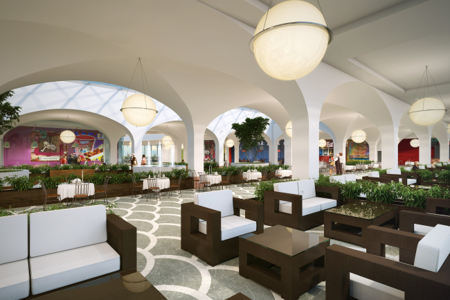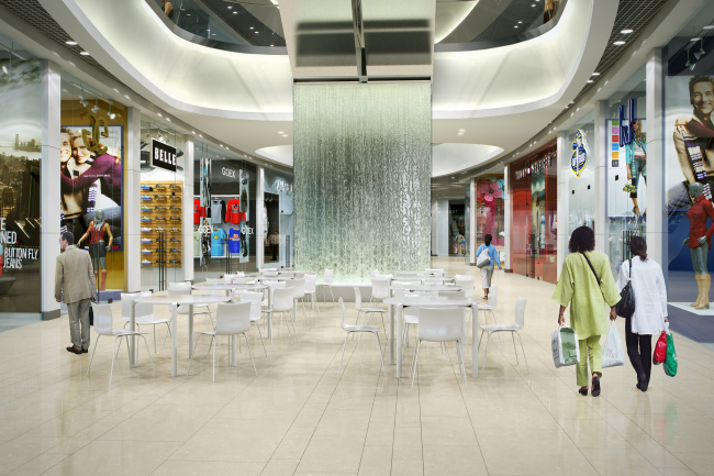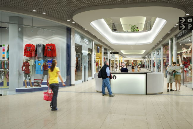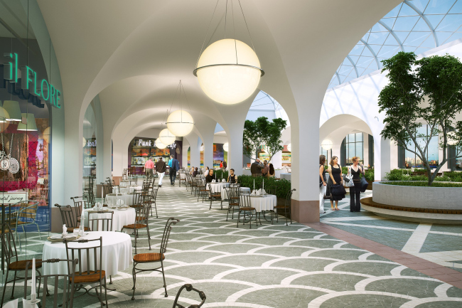 Из-за расположения парковки на крыше спроектировать верхний свет в зоне торговых галерей не представлялось возможным, поэтому архитекторы придумали специальные потолочные цилиндры из гипсокартона, окрашенного в белый цвет: их поверхность засвечивают прожекторы, благодаря чему создается полная иллюзия световых фонарей. Ресторанный дворик архитекторы постарались решить в стилистике площади европейского исторического города, усилив эту аллюзию с помощью характерного мощения, арочных сводов и верхнего света зенитных фонарей. На первом этаже в зонах кафе были установлены два водопада с подсветкой. Мобильные киоски и информационные стойки выполнены в одной стилистике и имеют округлую форму, повторяющую линию атриума.