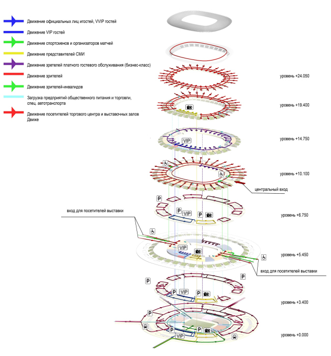 Помимо лестниц система вертикальных коммуникаций стадиона включает лифты и эскалаторы в зоне главного входа, где холм торжественно «размыкается». Именно верхние трибуны на 9 тысяч мест обеспечат арене ту суммарную вместимость, которая необходима для проведения здесь матчей футбольных чемпионатов мира и Европы. Но поскольку такие события априори не будут случаться слишком часто, архитекторы предусмотрели, что все инфраструктуры обслуживания «чаши» (туалеты, заведения общественного питания и т.д.) могут функционировать по временной схеме: по окончании матча они разбираются и складируются в специально отведенном помещении.