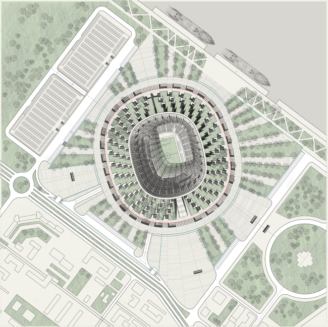 «У нас с самого начала не было сомнений в том, каким должен быть этот объект, – вспоминает Никита Явейн. – Мы понимали, что главным входом стадион необходимо ориентировать на юг, в сторону Канавинского моста, ведь именно с него к арене будут направляться основные потоки автомобилей и наземного общественного транспорта. И столь же очевидным для нас было то, что это должен быть максимально зеленый объект, ведь его ближайшее окружение – индустриальная застройка, довольно унылая и хаотичная. Лэндмарк здесь, конечно, необходим, но лэндмарк именно зеленый, способный не просто «застолбить» территорию, но вдохнуть в нее жизнь».