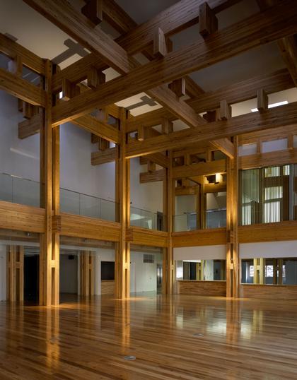 Эта внутренняя «площадь» отделена от внешней раздвижными дверьми, которые быть постоянно открыты в теплое время года; так будет возникать единое общественное пространство. Из японского кедра сделаны не только стены, но несущая конструкция здания: двойная решетчатая балочная структура с вертикальными опорами, разнесенными друг от друга на 18 м.
