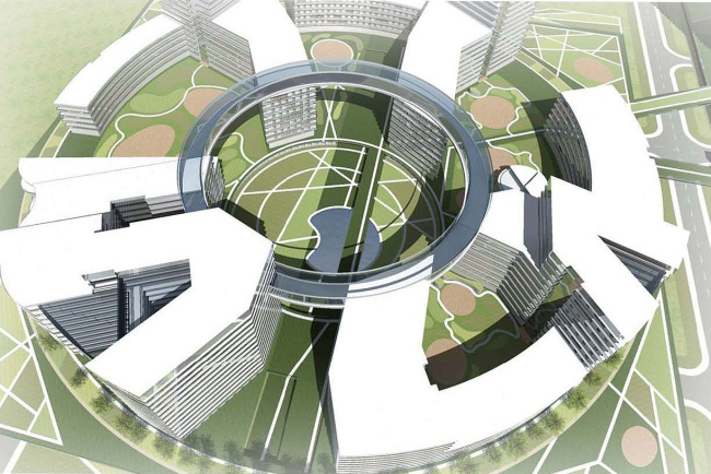 Вписав круг в зеленый прямоугольник парка, архитекторы затем разрезали его широкой эспланадой, идущей с севера на юг. В первую очередь, это необходимо было сделать с точки зрения инсоляции, чтобы система внутренних дворов не осталась без солнечного света. Кроме того, зеленая диагональ раскрыта прямо на высотку, стоящую на противоположной стороне улицы. Еще один зеленый коридор «пробит» к улице Некрасова: архитекторы здраво рассудили, что двух входов на территорию столь большого комплекса будет явно маловато. «Если бы мы составили дом из отдельных корпусов-секторов, то у нас не получилось бы выйти на необходимый уровень площадей, – рассказывает Иванов, – поэтому практически от каждого дома мы пустили к центру объемы-протуберанцы». Это позволило не только получить требуемое количество квадратных метров, но и разбить внутреннее пространство на систему не похожих друг на друга дворов, благодаря чему у каждого дома появилась своя обособленная территория.