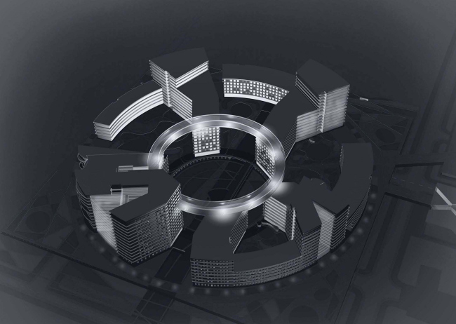 Есть здесь и общая центральная площадь – естественно, круглая. А поскольку лето в Новосибирске длится от силы пары месяцев, функционально это общественное пространство продублировано с помощью крытой пешеходной галереи, в плане также имеющей круглую форму. Причем архитекторы не опоясывают ею площадь, но поднимают кольцо галерей на уровень верхней отметки зданий. Фактически над площадью появляется такой нимб, стеклянное кольцо, визуально объединяющее разрозненные корпуса в единую композицию. В темное время суток оно может подсвечиваться и тем самым станет заметным ориентиром в масштабах всего города.