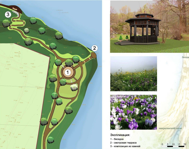 Помимо въездной группы, архитекторы выделили на территории поселка еще четыре зоны. Ближе всего к въезду расположена так называемая ферма с прудиком для птиц и площадкой для выпаса животных, а также эллингом для хранения яхт. К юго-западу от фермы разместилась еще одна зона для созерцательного отдыха, которую сами архитекторы называют «садом камней». Дело в том, что помимо скульптур, на участке с санаторских времен сохранилось несколько огромных валунов – вокруг них авторы разбивают живописный газон, а в непосредственной близости проектируют беседку, ориентированную на гладь водохранилища. От беседки по юго-восточной границе участка тянется пешеходная дорожка, вторящая прихотливым изгибам береговой линии. Это главный пешеходный бульвар будущего поселка, и для него архитекторы постарались придумать максимально насыщенный сценарий. Вдоль всего променада они размещают малые формы – арки, скамейки, клумбы, – каждую из которых превращают в запоминающийся ориентир.