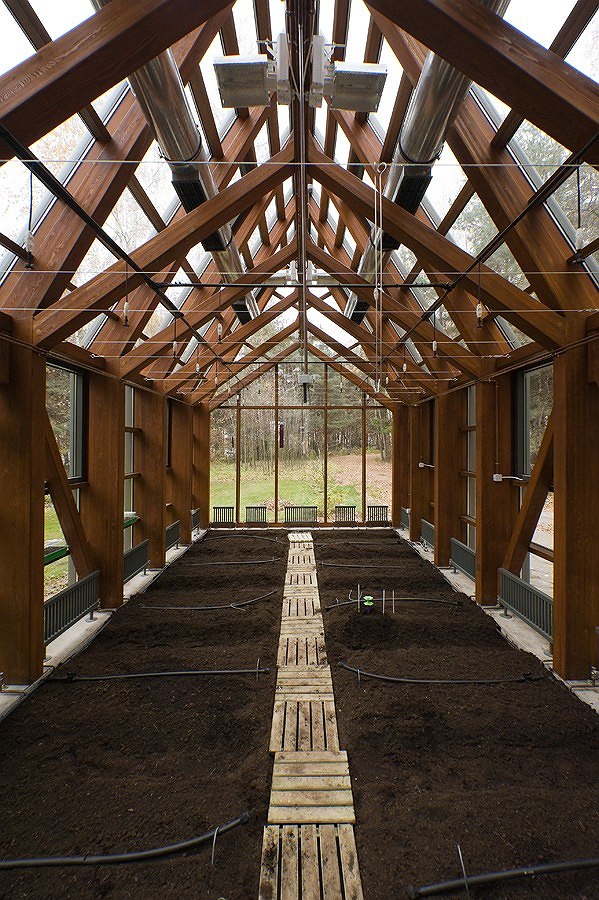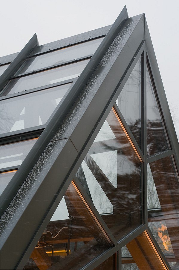Оранжерея состоит из основного помещения для выращивания растений, тамбура, в котором расположены датчики инженерных систем и крыльца и представляет собою остекленный объем с высокой скатной крышей. Прозрачный кожух «натягивается» на каркас из клееной древесины, состоящий из ажурных несущих рам и соединяющих их раскосов и укрупненной фермы. Кузембаев верен себе: все конструктивные узлы здесь спроектированы со скрытыми крепежными элементами, а некоторые элементы фермы являются неотъемлемой частью несущей рамы, благодаря чему деревянный скелет этого здания кажется хитроумно составленным пазлом.