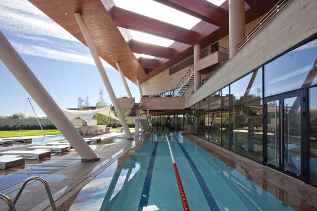 Интересно, что лишь одно из «крыльев» сделано сплошным, тогда как второе прорезано треугольниками разных форм, и заданная здесь тема пергол становится для этого здания одной из ключевых. Многочисленные навесы фактически окружают здание по периметру, формируя крытые промежуточные пространства, связывающие внутренние помещения с окружающим ландшафтом. Нельзя не признать, что для данной типологии такое решение оптимально: внутреннее пространство центра вмещает в себя два уже упомянутых корта, фитнес-центр, спа-салон, детский клуб и кафе, со стороны реки к зданию примыкают спортплощадки, а крытый бассейн плавно перетекает в открытый.
