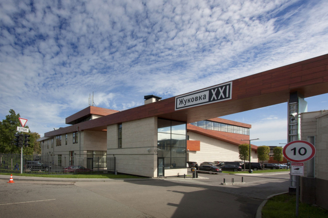 Коттеджный поселок «Жуковка ХХI» расположен в 9 километрах от МКАД по Рублево-Успенскому шоссе, в пойме Москвы-реки. В плане он имеет форму веера, разделенного на две неравные части Ильинским шоссе, и именно в створе, образованном трассой и излучиной реки, организован въезд на территорию. Здесь же расположен главный объект поселковой инфраструктуры – общественно-спортивный центр. Этот объем изначально задумывался как визитная карточка всего комплекса, символ, который бы выгодно выделял «Жуковку XXI» на фоне соседних отнюдь не заурядных поселков. Так что совсем неудивительно, что на архитектурное решение центра заказчик объявил конкурс, правда, было это довольно давно, и с тех пор функциональная программа проекта не раз претерпевала серьезные изменения. «Можно сказать, что это проект-долгожитель, ведь конкурс мы выиграли еще в 2004 году, – рассказывает Андрей Асадов. – Впрочем, даже несмотря на многочисленные доработки, нам удалось сохранить первоначальный архитектурный замысел, вдохновивший заказчика и позволивший одержать победу в конкурсе».
