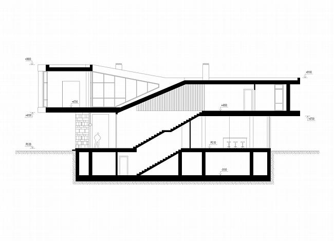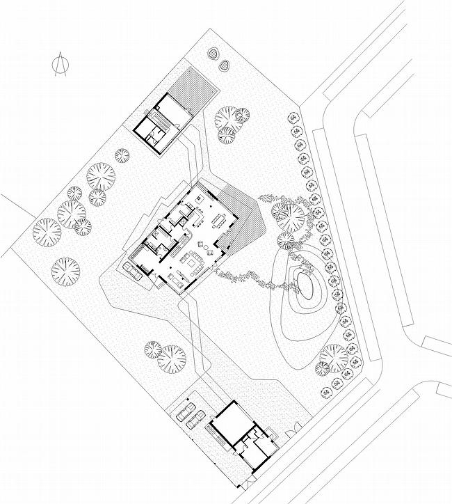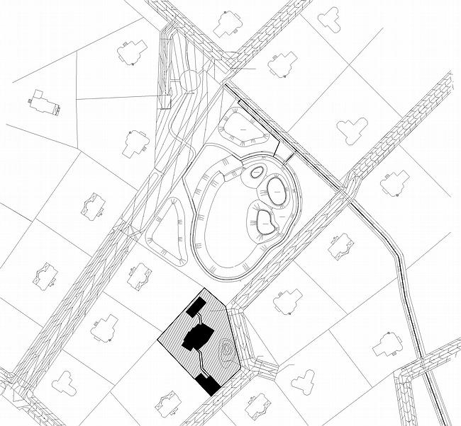 Поскольку «под змеей» поместились не все необходимые служебные помещения, оставшаяся часть убрана в подвал. Кстати сказать, это не единственное подземное помещение на этом участке – также под землей, в отдельном строении, расположен бассейн, отмеченный сверху небольшим павильоном с комнатой отдыха и террасой с видом на пруд. Все постройки соединяются между собой подземными переходами.