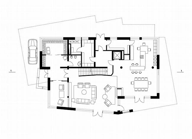 Не смотря на то, что участок находится около пруда, водную гладь с него почти не видно. Поэтому, если не считать эркеров спален, выглядывающих в эту сторону, авторы замкнули дом на самом себе. «Представьте себе линию, в которую выстроены все помещения, начиная от наиболее открытой для всех входной группы и заканчивая самой приватной комнатой, хозяйской спальней. Она получится достаточно длинной – рассказывает один из руководителей бюро, Никита Токарев: чтобы все это поместилось на участке, мы ее свернули пополам и подняли приватную часть на второй этаж». Таким образом, спальня оказалась над входом, а композиция в целом напоминает змею, кусающую собственный хвост, – философски рассуждают авторы. Увеличение потолка в хозяйской спальне вполне отвечает образу зевающей змеиной головы. Место для «переползания» выбрано в зоне гостиной, которая, как сейчас принято, сделана двусветной. Мало того, линия потолка повторяется в лестнице, ставшей частью интерьера гостиной. Для полноты картины необходимо сказать, что в «ленту» не вошли хозяйственные помещения: они объединены в отдельный блок на первом этаже – собственно, это и есть то основание, на которое «заползает» верхняя часть гибкого «тела», включая голову-спальню. Архитекторы предполагают отделать нижний блок камнем не только снаружи, но и внутри, чтобы четко отделить от жилого пространства. Или живого?