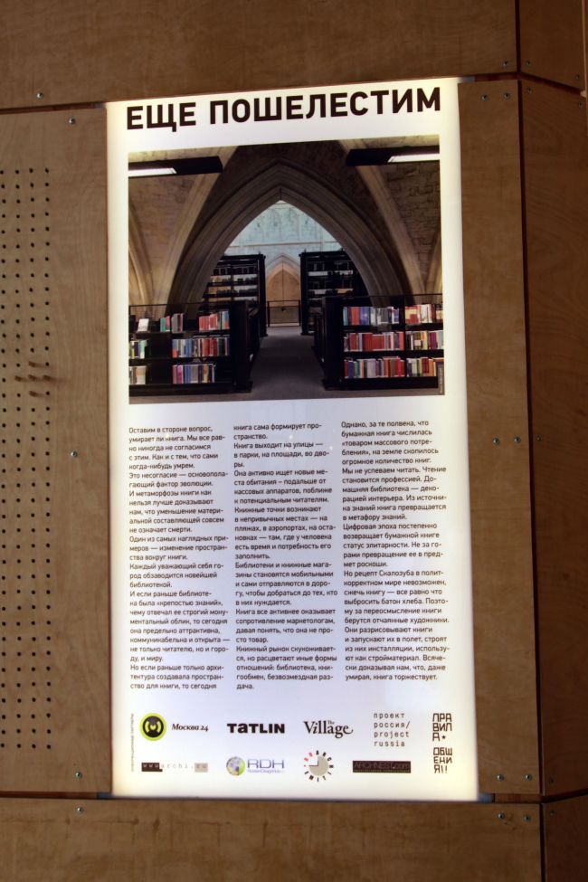 Самое же, пожалуй, важное то, что «Книгострой» охватывает и российский контекст. Тут, правда, некоторые вещи тоже притянуты почти искусственно: например, показывая зарубежные постройки последних лет, кураторы вдруг вплетают в экспозицию планшет про советские конкурсы на проекты домов книг 1930-х годов и модернистские реализации 1970-х – видимо, очень уж хотелось провести горделивую параллель между «книжками» на Новом Арбате и Национальной библиотекой Парижа (арх.Доминик Перро). А рассказывая о конкурсе на проект новой библиотеки в Праге, кураторы из всех 760 участников выбирают двух победителей и работу своих друзей из бюро Totement/Paper. Представлены здесь и два конкурса, в организации которых АРХИWOOD и «Книги в парках» принимали самое непосредственное участие – «Гоголь-модуль» и конкурс на проект книжного клуба в парке «Музеон», а также дружественный премии «Микродом».