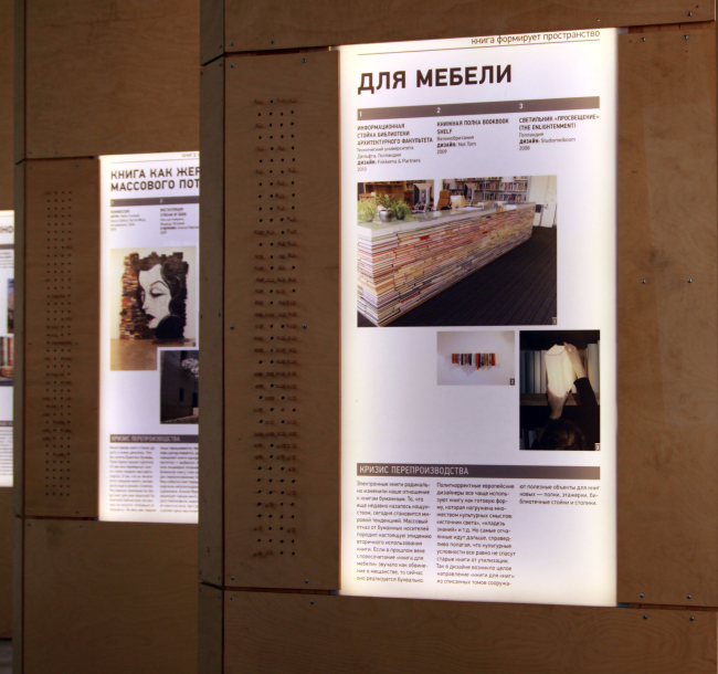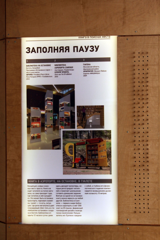 Возможностей для этого экспозиция действительно предоставляет массу. Наверно, даже если бы кураторы ограничились только показом новых западных библиотек, это имело бы эффект – читальни XXI века, которые строятся «там», ушли от привычных нам масштабных и закрытых от внешнего мира книгохранилищ так же далеко, как скоростной болид от гужевой повозки. Но они также включили в экспозицию множество иных типологий – на выставке можно увидеть и библиотеки на остановках общественного транспорта, и мини-читальни в аэропортах и на вокзалах, и всевозможные книгообменники, и книжные шкафы, из мебели превратившиеся в полноценные (и что важно, практичные!) объекты лэнд-арта. Не менее обширен и раздел, посвященный использованию книги как элемента декора или даже конструкции – здесь и фасады, выложенные из книг, и предметы мебели, и инсталляции, и примеры использования книг в сценографии. Каждой подборке кураторы стремились дать свое название и сопроводить краткой аннотацией; и хотя из этих заголовков и текстов видно, что некоторые темы слегка притянуты за уши («Книга как травма» – это , например, арт-объекты, посвященные книгам, но сами из книг не состоящие и их не содержащие), нельзя не оценить их поэтичность – сразу чувствуется, что выставка сделана людьми, обожающими не только читать, но и писать.
