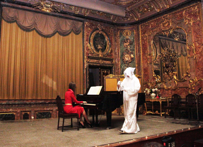 Орнамент – вещь эвентуально содержательная, и при ближайшем рассмотрении может открыть пониманию множество интересных фактов. Этим организаторы и воспользовались. Весь второй этаж дома союза архитекторов был поделен на четыре зоны, каждая из которых отвечала за возможную составную часть орнамента. В основу построения смысла каждой из зон легла коллизия принципов восприятия и созидания. В результате каждая из них предполагала, что посетитель должен совершить выбор или хотя бы обдумать предложение. И тут весь знаковый смысл выражался уже не словами, а разнообразными альтернативными способами выражения – кино, живопись, музыка. В одной из комнат были активно задействованы ощущения. Под гротескное мигание стробоскопа гости просовывали руки в черные коробки и пытались идентифицировать их содержимое. В другой комнате они наслаждались торжественной камерностью и умиротворением развевающихся полотен ткани, наблюдая невозможность соединения черно-белого с цветным. В третьей зоне ультрафиолет освещал выполненные в неожиданной манере известные всем полотна, а в четвертой – под пылающим холодом небом Бронзового зала Месмахера звучал рояль в тандеме с музыкальным треугольником .