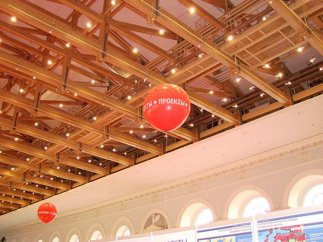 В этом году юбилейное «Зодчество» выглядит несколько богаче, чем в предыдущем – оно ощутимо укрупнилось, стенды и картинки стали побольше, коридоры между ними просторнее, развлекающие посетителей «затеи» равномерно распределены по пространству Манежа. Под ногами ярко-красный ковер, вверху парят надувные шарики – на каждом написано название раздела, чтобы заблудившийся посетитель мог, подняв голову, сориентироваться в хитросплетениях всероссийского фестиваля.