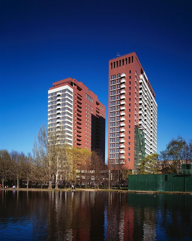 Как всегда бывает, в процессе воплощения эстетствующая схоластика срастается с нашей реальностью, частью намеренно, частью – уступая и что-то утрачивая. Зеркальность, например, имеет вполне прагматическое обоснование – за обращенными внутрь кирпичными стенами спрятаны различные коммуникации и технические помещения, здесь нет квартир, потому что пластины стоят слишком близко и мог бы возникнуть эффект, емко называемый «окно в окно». Кроме того, чтобы не испортить пейзаж, пластины ориентированы торцами к склону Воробьевых гор. А чтобы удачнее показать окружащие красоты всем входящим-выходящим из здания, архитектор превратил расположенную между домами «перекладину» холла в большое панорамное окно. Это могли быть две строго продуманных, как ведута ренессанса, ландшафтные картины, одна на с видом пруд, другая на Москва-реку, огражденные перспективной рамкой зданий. Все это даже построили. А потом сразу же переделали интерьер холла, полностью загородив все виды – не пропадать же квадратным метрам. В наше время эстетское любование окрестностями «просто так», без видимой пользы да еще и в общественном пространстве – роскошь почти недоступная. Что поделаешь, период накопления.