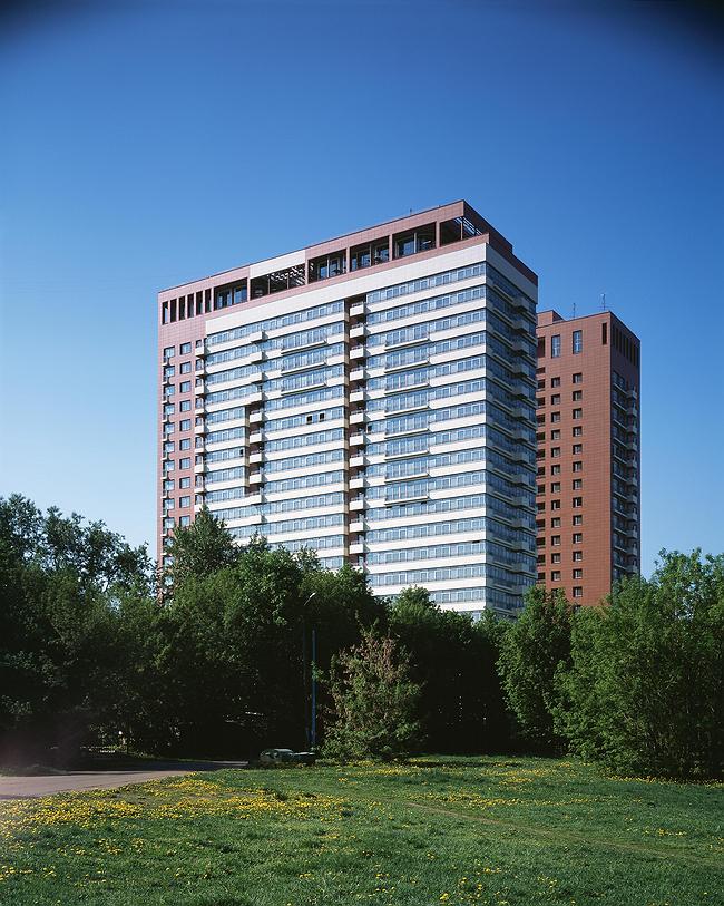 Это очень хорошо расположенный дом. Он разместился в парково-академической зоне города, на границе зеленого массива Воробьевых гор, он стоит над прудом Дворца пионеров и отражается в нем.