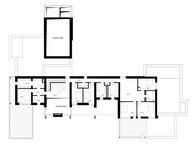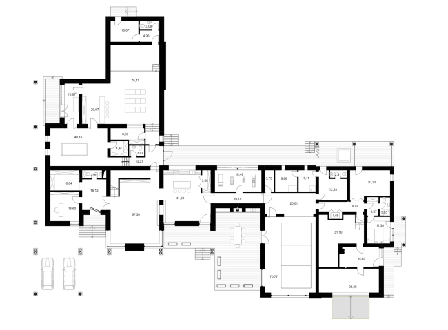 Правый «флигель», вместивший в себя все спортивные функции, требующие закрытых помещений, – тренажерный зал, бассейн и парную, – вылетает вперед динамичным стеклянным объемом, плоская кровля которого служит большой террасой, от солнца и осадков защищенной длинным волнообразным козырьком. Слева композиция уравновешивается строгим навесом, условно принимающим на себя роль левого «флигеля». Под ним организована прогулочная зона, ведущая к центральному входу в дом, а сам навес превращен еще в одну террасу – на этот раз открытую.