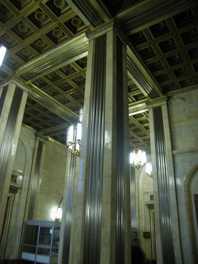 Техническая сложность конструкции здания определила характер его интерьеров: высотка у Красных ворот – самая скромная из всех семи собратьев. Здесь нет роскошных холлов, как в парадной университета или витражей Корина, как в высотке на площади Восстания. Самая парадная часть здесь – небольшой вестибюль, отделанный нержавеющей сталью. Как писал сам Алексей Душкин, он «должен был, как на станции Маяковская, подчеркнуть несущую способность стальной конструкции, полностью освободив ее от всех балластных масс». Иначе говоря – декоративные стальные элементы, которые мы видели на колоннах и стенах, закрывают сами конструкции, но в то же время демонстрируют ее металлическую сущность.