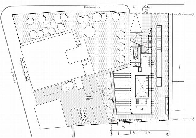 Этот удивительный дом похож на элегантную оранжерею в саду, случайно не тронутую строительной лихорадкой мегаполиса. Он задуман в старом центре Москвы, на полузадушенной строительством Остоженке. Крошечный участок, купленный заказчиком в Хилковом переулке, зажат между новым 6-этажным домом компании «Баркли» и автомобильной стоянкой на задах усадьбы Тургеневых. Участок легко можно было бы отнести к категории безнадежных, но получилось все наоборот – обилие трудностей стало мощным стимулом для профессионализма девелопера и архитектора.