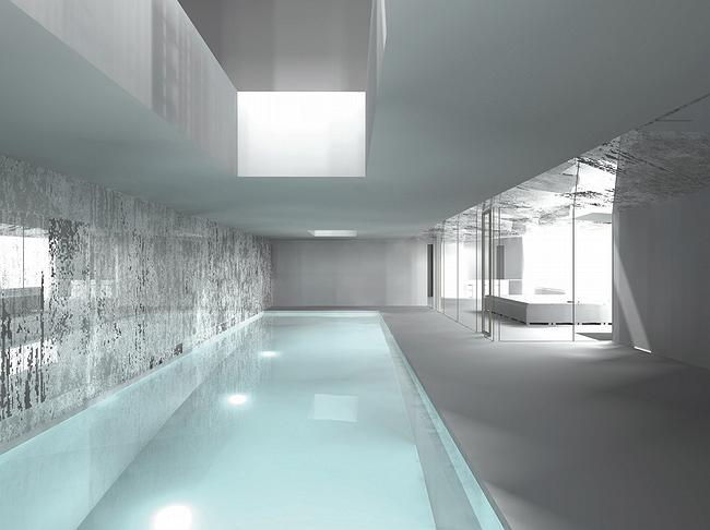 Минус-второй этаж целиком посвящен отдыху, спорту и развлечениям. С одной стороны здесь сад, с другой бассейн, сауны, солярии, фитнес и прочее. Они разделены стеклянной стеной – прозрачной, чтобы пропускать свет, но не пар из водной части в садовую, чтобы не вредить растениям. Стена бассейна сделана из того же полупрозрачного и подсвеченного изнутри камня. Таким образом, со стороны гостиной и бассейна возникает два двухсветных пространства: гостиной и зимнего сада, параллельных, но смещенных одно относительно другого по высоте и поэтому не слитых в одно, а как будто бы соприкасающихся и перетекающих одно в другое. В обоих жилых ярусах продуманы асимметричные горизонтальные стеклянные «окна» в полах-потолках. Дневной свет, таким образом, постепенно растворяясь, проникает до второго яруса и выстраивается в подобия световых колодцев, передающих и распределяющих свет. От этого ярусы становятся проницаемыми, пространство – светлым, перетекающим и воздушным. Третий этаж – технический, в нем, кроме систем жизнеобеспечения, гараж на 8 машин, соединенный с поверхностью лифтом, и помещения для охраны.