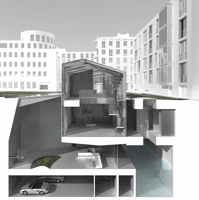 Однако здесь, в новом проекте Сергея Скуратова, мы имеем дело с совершенно новой типологией городского жилого дома. Проект предлагает радикально новое решение не только внутреннего жилого пространства, но и всей системы взаимоотношений дома и города. Подземная часть виллы многократно превышает внешний объем. Практически вернув городу свободный и зеленый участок, она оставляет ему всего несколько принципиально важных жизненных функций – въезда и входа в дом, а также огромного, почти избыточного источника света и воздуха. Внешний объем лишен и традиционных признаков дома – дверей, окон, глухих стен и крыш. Дверь заменяет плита со стержнем посередине. Плита вращается вокруг оси-стержня, открывая и закрывая въезд в гараж и вход в дом. Вся поверхность внешнего объема задумана состоящей из чередующихся пластин закаленного стекла и специально обработанного тонкого зеленоватого мрамора.