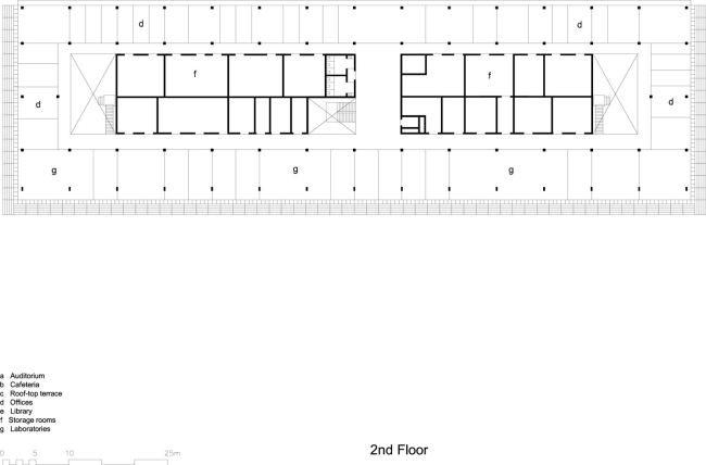Архитектурный образ главного здания института строится на сочетании двух контрастных объемов: горизонтально ориентированной плиты и поставленного точно в центре нее кубика. Нижняя часть комплекса включает в себя два полностью остекленных этажа, верхняя же представляет собой облицованный деревянной рейкой квадратный в плане объем. На первых двух этажах по внешнему периметру здания размещены лаборатории, для полноценного функционирования которых необходимо максимальное количество дневного света, а в центре сосредоточены помещения, наоборот, нуждающиеся в затемнении. Источником солнечного света для офисов служит центральный объем с тремя световыми фонарями на плоской кровле.