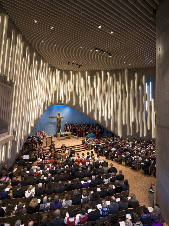 Дневной свет поступает в здание через вертикальные окна разной ширины, визуально дробящие основной объем на неравномерные сегменты. По контрасту с внешним обликом храма его интерьеры выполнены из традиционных для скандинавского дизайна материалов – натурального дерева и необработанного бетона.