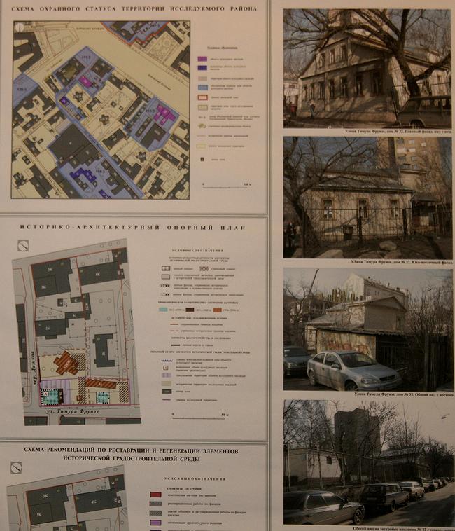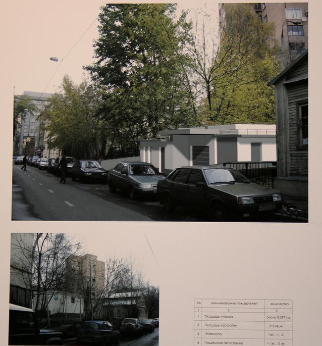 На улице Тимура Фрунзе, образуемой бывшей фабрикой «Красная роза», ныне известной по центру дизайна Art Plaу, рядом с пересечением этой улицы с Дашковым переулком предполагается построить 2-х уровневую подземную автостоянку (ООО «Арх-проект 2», арх. В.В. Ходнев). Исторически на этом месте была городская усадьба, которая «сейчас локализована» – то есть от нее осталось только двухэтажное деревянное здание главного дома. Рядом с ним, по адресу Дашков переулок, 7, находится памятник архитектуры. Однако фронт застройки улицы частично утрачен, нет флигелей усадьбы и «в градостроительном отношении улица нуждается в регенерации». По проекту предлагается сделать подземный паркинг, проходящий под деревянным домом – который, хоть он и не является памятником, заказчики решили ни за что не сносить и даже не переносить его для пущей безопасности – за что были похвалены экспертами. В существующей фронта застройки улицы будет размещена входная зона и лифтовой спуск в гараж. Его архитектуру на данном предпроектном этапе не обсуждали, но эксперты дали понять, что если здание и будет современным, то оно должно быть очень скромным, одноэтажным и увязываться с соседями. Принятому проекту пожелали «реализоваться в таком же красивом виде, в каком он и был представлен».