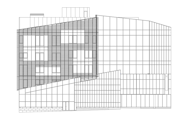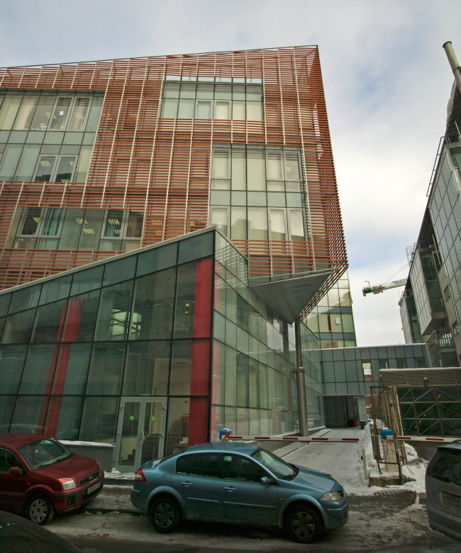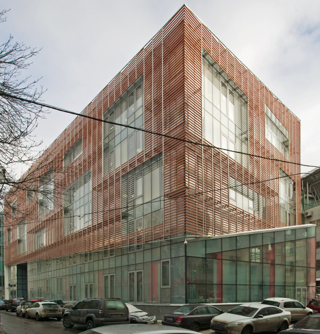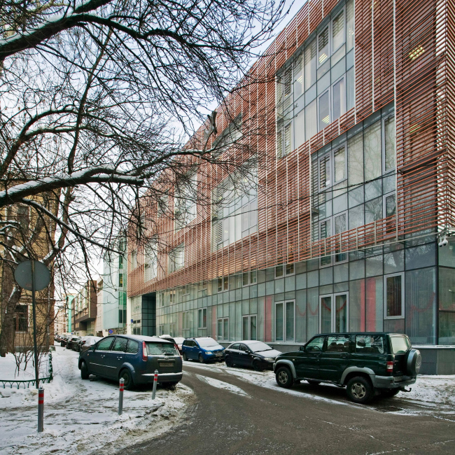 Прозрачная непрозрачность получилась благодаря тому, что стеклянные, покрытые мелкой точкой шелкографии фасады здания со стороны улицы закрыты решетками горизонтальных керамических ламелей: тонких полосок терракотового цвета. Полосатое полотно местами разорвано крупными прямоугольниками псевдо-«окон», которые больше обычных окон, возможных в таком здании, раза в два-три. Декоративные проемы асимметрично разбросаны по фасадам, они оживляют и усложняют их ритм, к тому же добавляют сходства с «обычным зданием», с архетипами города, согласно которым домам полагается иметь окна.