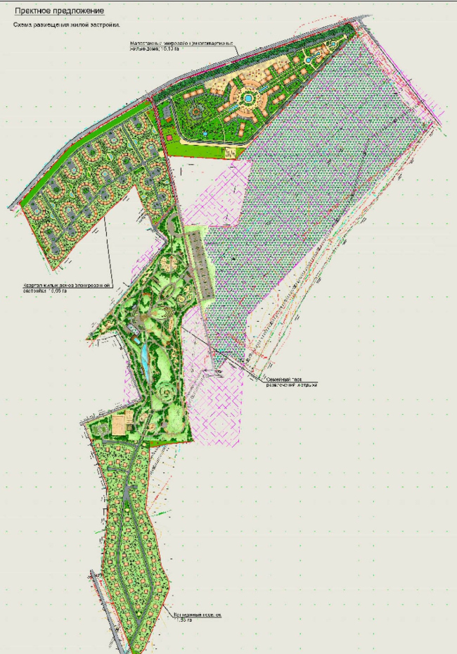 Вообще у заказчика на момент проведения конкурса уже была схема функционального зонирования будущего поселения, на которой планировки всех трех кварталов были проработаны довольно подробно, однако участники состязания могли менять ее по своему усмотрению, и команда Алексея Иванова этой возможностью воспользовалась. Сам участок в плане представляет собой крайне замысловатую фигуру, которую, наверно, можно сравнить разве что с молотком с одним заостренным концом. Это заострение – граница ближайшего к дороге участка, который планируется отвести под микрорайон малоэтажной многоквартирной застройки. По другую сторону от условной «ручки» раскинулся более прямоугольный в плане участок таунхаусов, перпендикулярно дороге вытянулась территория будущего парка, а уже за ней – будущий коттеджный поселок, который сам по себе в плане напоминает рыбку, хвостом примкнувшую к парку, а острым носом развернувшуюся подальше от шоссе.