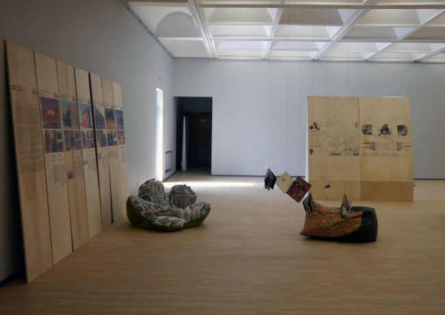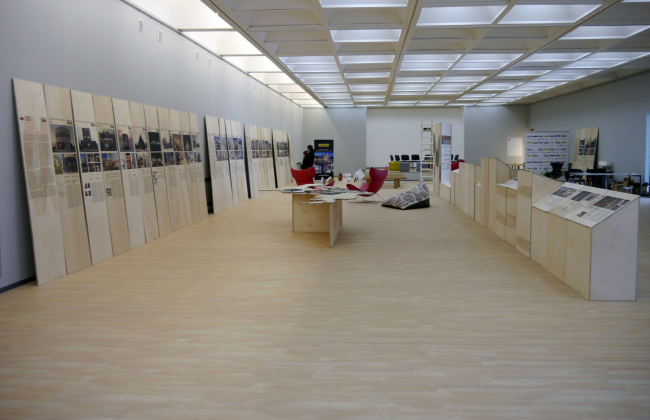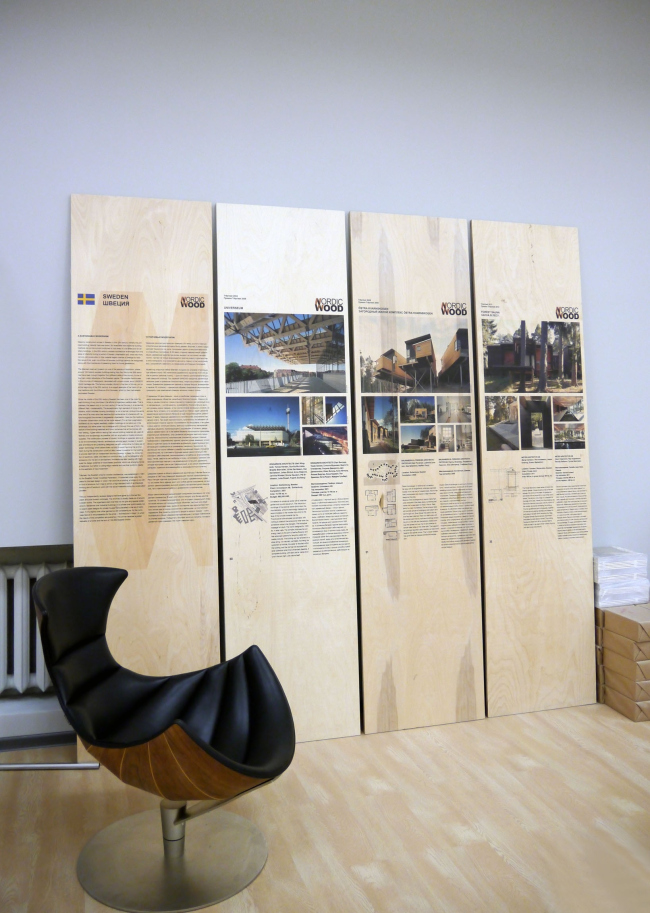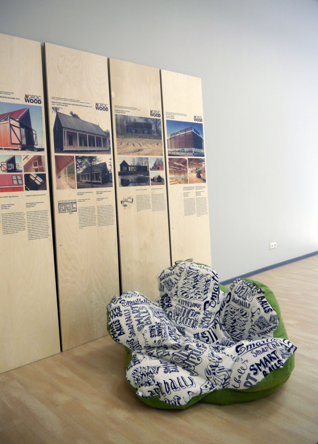 Выставка, показывающая достижения деревянной архитектуры ближайших северных соседей России, и сама вполне предсказуемо получилась деревянной. Авторами экспозиционного решения выступили архитекторы Никита Асадов и Елизавета Фонская (MADETOGETHER), а за воплощение их концепции отвечали Иван Овчинников и МАФ (Мастерская архитектурных форм). В роли стендов здесь выступают длинные и широкие деревянные доски, по одной на каждый объект. Количество фотографий и длина описания построек могут варьироваться, но сами доски различаются разве что нюансами рисунка спила. И к стенам они никак не прикреплены, а просто приставлены, что придает экспозиции тон непринужденный и временный – кажется, доски прибыли сюда прямо со стройки и по окончании фестиваля отправятся туда же, чтобы стать частью какого-нибудь нового строения.