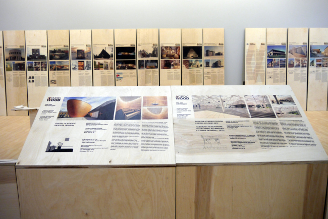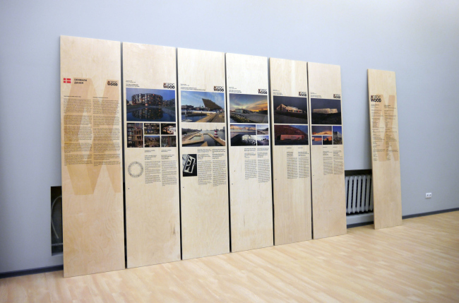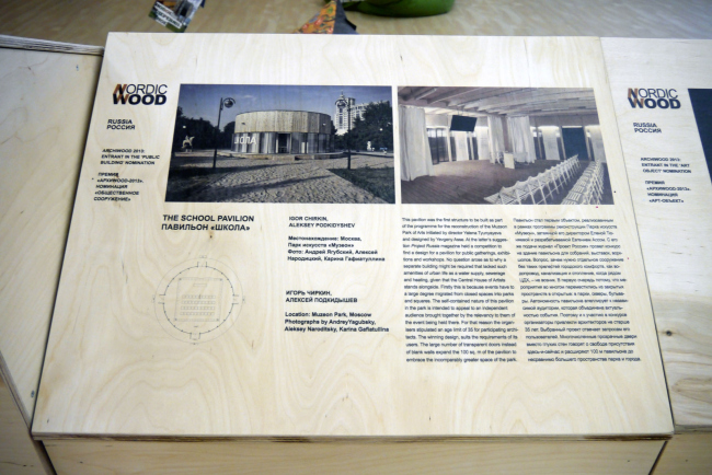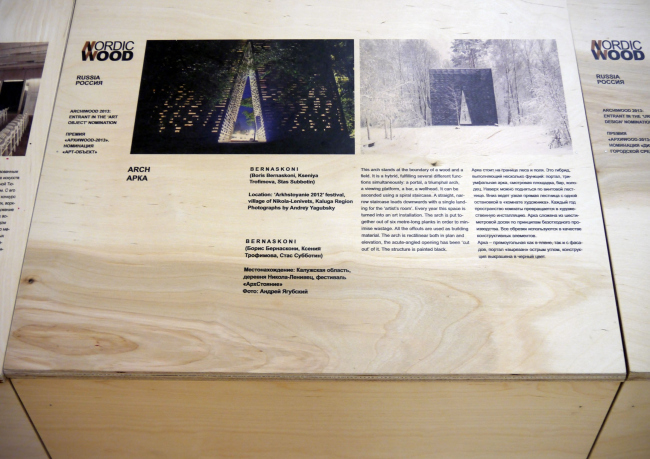 На этих досках, собственно, и представлены дружественные премии в области деревянной архитектуры. На каждую страну отведено от четырех до семи полотнищ, одно из которых кратко рассказывает о национальных особенностях строительства из дерева в Швеции, Дании, Финляндии, Норвегии, Латвии и Эстонии, а остальные показывают сами объекты, удостоенные наград. И хотя России, благодаря АРХИWOOD, тоже есть что продемонстрировать (краткий пересказ трехлетней истории премии потянул на десять досок), разница в отношении к деревянной архитектуре очевидна: у нас в этом жанре преобладают арт-объекты и малые формы, тогда как Северная Европа использует дерево по максимуму, строя из него многоквартирные дома и общественные здания, масштабные пешеходные пространства и даже промышленные объекты. Впрочем, и у нас дерево из т.н. «народной архитектуры» все активнее переходит в арсенал просто архитектуры. И прошлый год в этом смысле оказался едва ли не результативнее, чем десять ему предшествовавших: в частности, были построены павильон «Школа» (Игорь Чиркин, Алексей Подкидышев) и «Арка» Бориса Бернаскони, – кураторы не отказали себе в удовольствии показать их на выставке.