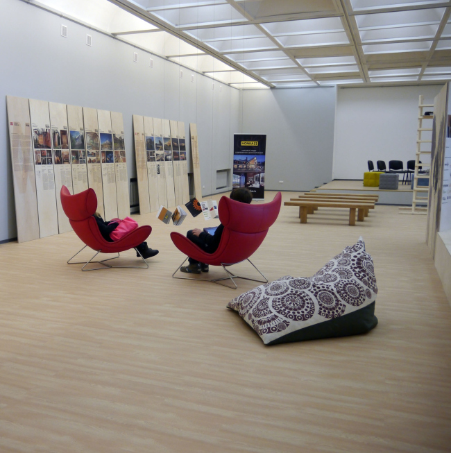 Экспозиция разместилась в фойе третьего этажа Центрального дома архитектора. Те, кому приходилось бывать в конференц-зале ЦДА, наверно, помнят это место – раньше это был достаточно темный предбанник, где иногда проводились фуршеты и перекусы после утомительных заседаний. Теперь, после ремонта, холл превратился в самодостаточное пространство со светлыми стенами, выразительной решеткой кессонов на потолке и небольшим подиумом в торце, позволяющим совмещать собственно выставочные проекты с проведением всевозможных дискуссий и выступлений. К слову, фестиваль Nordic Wood, открытие которого стало своего рода инаугурацией новой архитектурной площадки, использует ее возможности сполна: почти каждый день здесь проводятся круглые столы и лекции специалистов по деревянной архитектуре, а завтра, 23 марта, состоится Детский день, в рамках которого самые маленькие поклонники экозодчества смогут построить свои собственные домики.