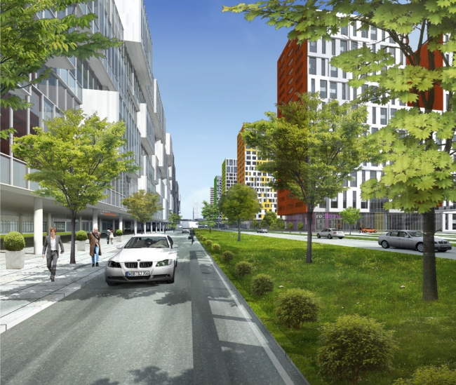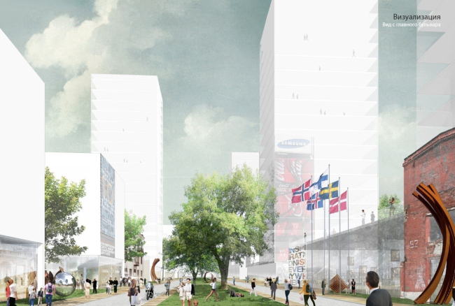 Многоэтажный дом-экран, образующий в плане букву М, есть и в проекте бюро «АрхПроект-2». Правда, команда Алексея Шутикова трактовала таким образом не жилое, а офисное здание, зигзагообразные корпуса которого защищают территорию от шума железной дороги. От малоэтажной жилой застройки оно отделено бульваром, часть которого проложено прямо сквозь офисные корпуса. Под углом 45 градусов к нему проложена пешеходная торговая улица – образованный этими осями «створ» и должен стать эпицентром общественной активности нового района, а местом их пересечения служит площадь, сформированная 2-3-х этажными объемами сохраняемых исторических зданий, которые предполагается объединить стеклянным фасадом стилобата.