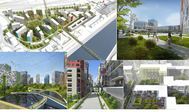 Обитаемая зеленая платформа и линейные здания стали главной темой и проекта, разработанного командой Вадима Ленка. Зигзагообразные полностью остекленные здания динамично и где-то даже хаотично врезаются в рукотворный ландшафт, образуя сложную систему дворов и скверов. Многие объемы приподняты на опоры, что, по замыслу авторов, сделает территорию комплекса более доступной для горожан, а сама экспрессивность генплана, видимо, призвана подчеркнуть его современность и близость к Москва-сити.