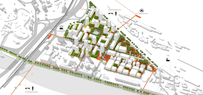 Едва ли не самую плотную и традиционно московскую застройку территории предложил коллектив под руководством Павла Андреева. Обнеся участок по внешнему периметру вспомогательными нежилыми функциями (так, от железной дороги новый район предполагается отделить буфером многоэтажных парковок с озелененными кровлями), архитекторы всю его основную площадь дробят на самодостаточные кварталы с благоустроенными внутренними дворами, образующими сквозные зеленые оси. Ближе к Киевскому вокзалу и не подлежащему сносу зданию ТЭЦ сгруппированы офисные здания, а между собой жилой и деловой районы связаны зеленым бульваром, который «простреливает» насквозь до Третьего транспортного кольца. Эта ось уравновешена перпендикуляром второго бульвара, выходящего к новому пешеходному мосту, который архитекторы предлагают перебросить к Новодевичьему монастырю.
